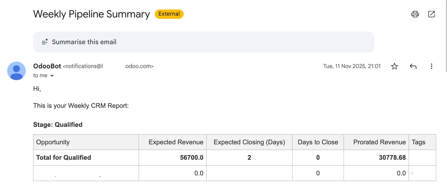 Standard Odoo lets you generate CRM reports, but it lacks the most crucial step: automatic scheduling and delivery. The Weekly CRM Report module bridges this gap. It automatically gathers your lead data, stage transitions, and performance metrics, sending a clean, professional report directly to your inbox.